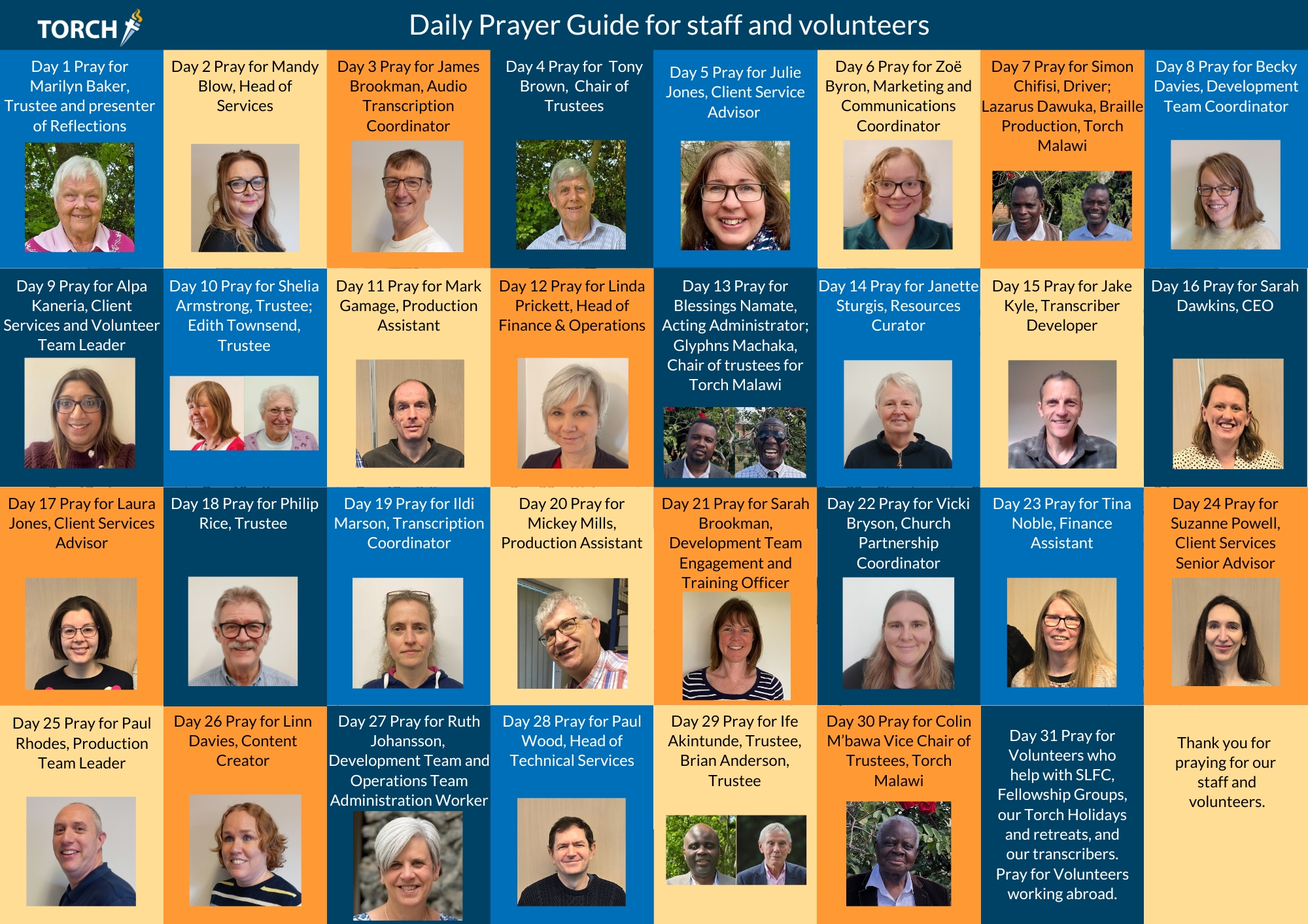 See our Daily Prayer Guide to help you pray for each of our staff, volunteers and trustees.